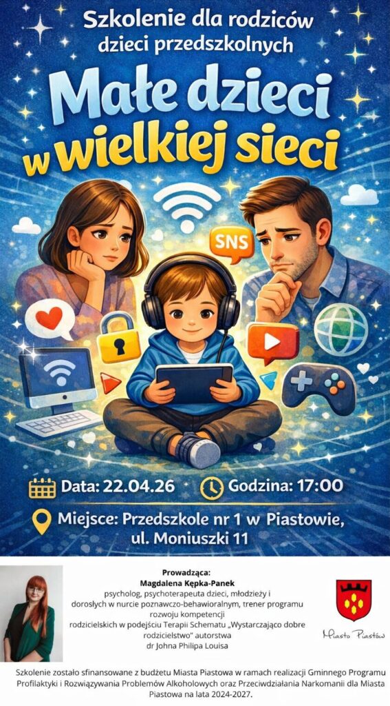 Serdecznie zapraszamy Rodziców dzieci przedszkolnych na szkolenie pt. „Małe dzieci w wielkiej sieci”, dotyczące higieny cyfrowej i bezpieczeństwa dzieci w cyberprzestrzeni.